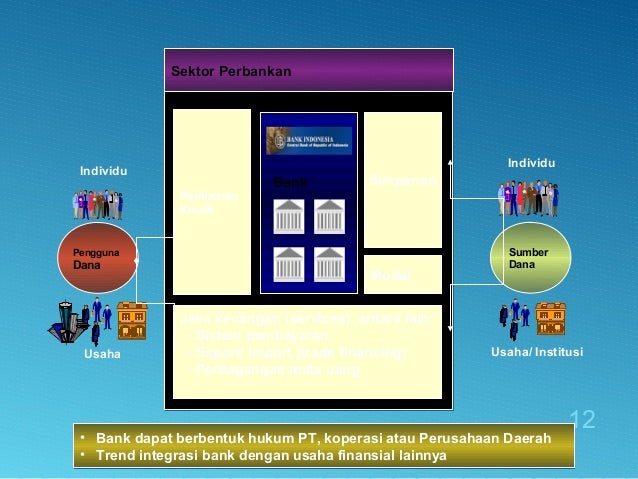 - 12. • Bank dapat berbentuk hukum PT, koperasi atau Perusahaan Daerah • Trend integrasi bank dengan usaha finansial lainnya • Bank dapat berbentuk hukum PT, koperasi atau Perusahaan Daerah • Trend integrasi bank dengan usaha finansial lainnya Sumber Dana Pengguna Dana Individu Usaha/ Institusi Individu Usaha Pemberian Kredit Simpanan Sektor Perbankan Bank Modal Jasa keuangan (services), antara lain: - Sistem pembayaran - Export/ import (trade financing) - Perdagangan mata uang 12