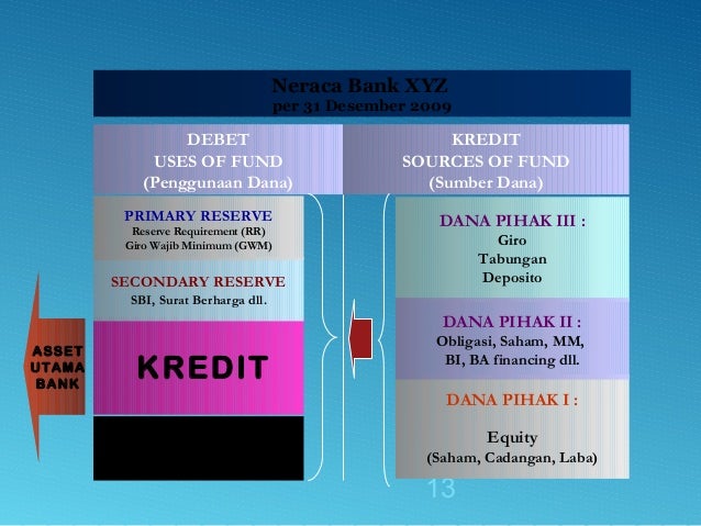 - 13. 13 DEBET USES OF FUND (Penggunaan Dana) KREDIT SOURCES OF FUND (Sumber Dana) DANA PIHAK I : Equity (Saham, Cadangan, Laba) DANA PIHAK III : Giro Tabungan Deposito ASSET UTAMA BANK KREDIT AKTIVA TETAP SECONDARY RESERVE SBI, Surat Berharga dll. Neraca Bank XYZ per 31 Desember 2009 PRIMARY RESERVE Reserve Requirement (RR) Giro Wajib Minimum (GWM) DANA PIHAK II : Obligasi, Saham, MM, BI, BA financing dll.