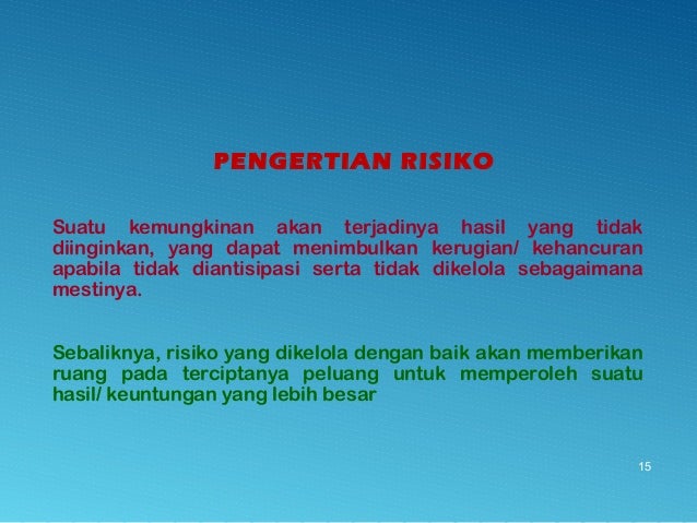 - 15. PENGERTIAN RISIKO Suatu kemungkinan akan terjadinya hasil yang tidak diinginkan, yang dapat menimbulkan kerugian/ kehancuran apabila tidak diantisipasi serta tidak dikelola sebagaimana mestinya. Sebaliknya, risiko yang dikelola dengan baik akan memberikan ruang pada terciptanya peluang untuk memperoleh suatu hasil/ keuntungan yang lebih besar 15