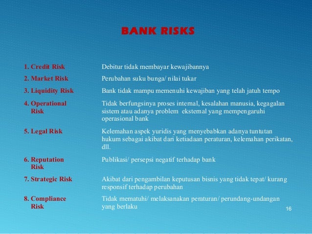 - 16. 16 BANK RISKS 1. Credit Risk Debitur tidak membayar kewajibannya 2. Market Risk Perubahan suku bunga/ nilai tukar 3. Liquidity Risk Bank tidak mampu memenuhi kewajiban yang telah jatuh tempo 4. Operational Risk Tidak berfungsinya proses internal, kesalahan manusia, kegagalan sistem atau adanya problem eksternal yang mempengaruhi operasional bank 5. Legal Risk Kelemahan aspek yuridis yang menyebabkan adanya tuntutan hukum sebagai akibat dari ketiadaan peraturan, kelemahan perikatan, dll. 6. Reputation Risk Publikasi/ persepsi negatif terhadap bank 7. Strategic Risk Akibat dari pengambilan keputusan bisnis yang tidak tepat/ kurang responsif terhadap perubahan 8. Compliance Risk Tidak mematuhi/ melaksanakan peraturan/ perundang-undangan yang berlaku