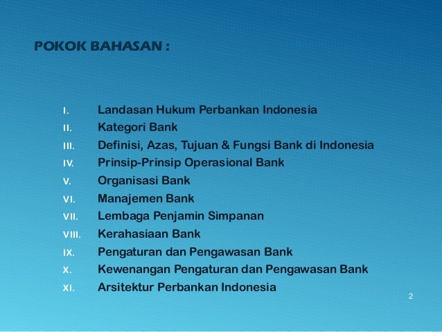 - 2. POKOK BAHASAN : I. Landasan Hukum Perbankan Indonesia II. Kategori Bank III. Definisi, Azas, Tujuan & Fungsi Bank di Indonesia IV. Prinsip-Prinsip Operasional Bank V. Organisasi Bank VI. Manajemen Bank VII. Lembaga Penjamin Simpanan VIII. Kerahasiaan Bank IX. Pengaturan dan Pengawasan Bank X. Kewenangan Pengaturan dan Pengawasan Bank XI. Arsitektur Perbankan Indonesia 2