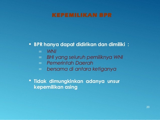 - 20. KEPEMILIKAN BPR 20 BPR hanya dapat didirikan dan dimiliki : = WNI = BHI yang seluruh pemiliknya WNI = Pemerintah Daerah = bersama di antara ketiganya Tidak dimungkinkan adanya unsur kepemilikan asing