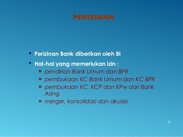 - 21. PERIZINAN 21 Perizinan Bank diberikan oleh BI Hal-hal yang memerlukan izin : = pendirian Bank Umum dan BPR = pembukaan KC Bank Umum dan KC BPR = pembukaan KC, KCP dan KPw dari Bank Asing = merger, konsolidasi dan akuisisi