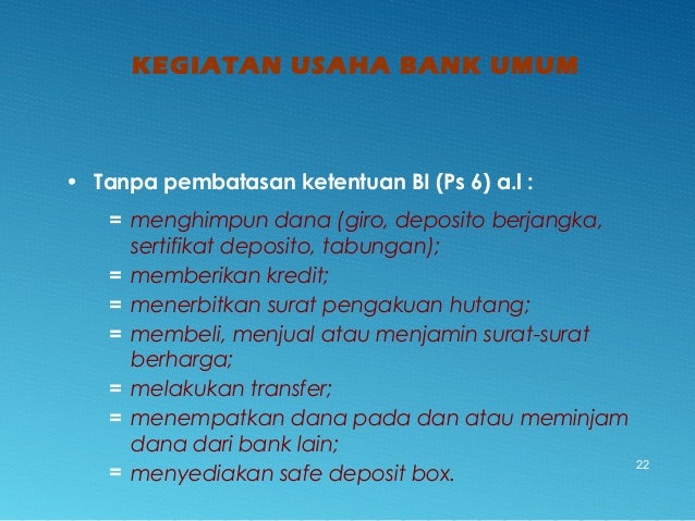 - 22. KEGIATAN USAHA BANK UMUM 22 • Tanpa pembatasan ketentuan BI (Ps 6) a.l : = menghimpun dana (giro, deposito berjangka, sertifikat deposito, tabungan); = memberikan kredit; = menerbitkan surat pengakuan hutang; = membeli, menjual atau menjamin surat-surat berharga; = melakukan transfer; = menempatkan dana pada dan atau meminjam dana dari bank lain; = menyediakan safe deposit box.