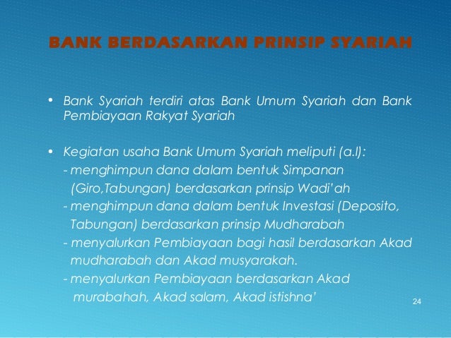 - 24. BANK BERDASARKAN PRINSIP SYARIAH 24 • Bank Syariah terdiri atas Bank Umum Syariah dan Bank Pembiayaan Rakyat Syariah • Kegiatan usaha Bank Umum Syariah meliputi (a.l): - menghimpun dana dalam bentuk Simpanan (Giro,Tabungan) berdasarkan prinsip Wadi’ah - menghimpun dana dalam bentuk Investasi (Deposito, Tabungan) berdasarkan prinsip Mudharabah - menyalurkan Pembiayaan bagi hasil berdasarkan Akad mudharabah dan Akad musyarakah. - menyalurkan Pembiayaan berdasarkan Akad murabahah, Akad salam, Akad istishna’