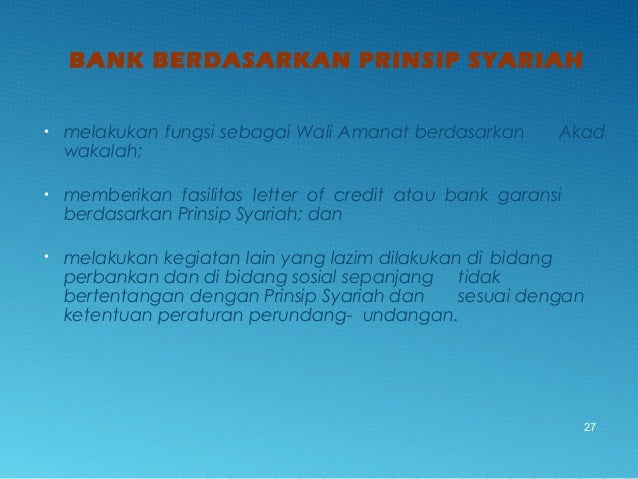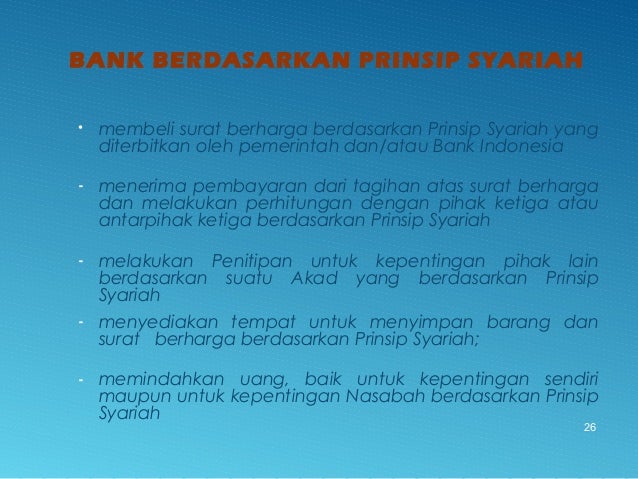 - 26. BANK BERDASARKAN PRINSIP SYARIAH • membeli surat berharga berdasarkan Prinsip Syariah yang diterbitkan oleh pemerintah dan/atau Bank Indonesia - menerima pembayaran dari tagihan atas surat berharga dan melakukan perhitungan dengan pihak ketiga atau antarpihak ketiga berdasarkan Prinsip Syariah - melakukan Penitipan untuk kepentingan pihak lain berdasarkan suatu Akad yang berdasarkan Prinsip Syariah - menyediakan tempat untuk menyimpan barang dan surat berharga berdasarkan Prinsip Syariah; - memindahkan uang, baik untuk kepentingan sendiri maupun untuk kepentingan Nasabah berdasarkan Prinsip Syariah 26