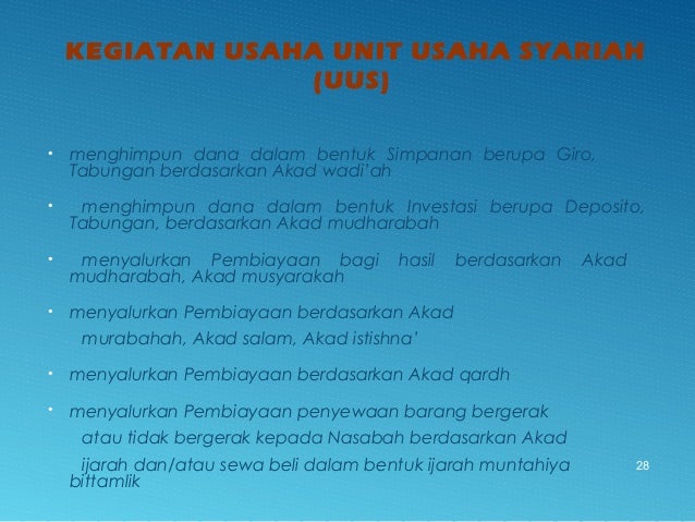 - 28. KEGIATAN USAHA UNIT USAHA SYARIAH (UUS) • menghimpun dana dalam bentuk Simpanan berupa Giro, Tabungan berdasarkan Akad wadi’ah • menghimpun dana dalam bentuk Investasi berupa Deposito, Tabungan, berdasarkan Akad mudharabah • menyalurkan Pembiayaan bagi hasil berdasarkan Akad mudharabah, Akad musyarakah • menyalurkan Pembiayaan berdasarkan Akad murabahah, Akad salam, Akad istishna’ • menyalurkan Pembiayaan berdasarkan Akad qardh • menyalurkan Pembiayaan penyewaan barang bergerak atau tidak bergerak kepada Nasabah berdasarkan Akad ijarah dan/atau sewa beli dalam bentuk ijarah muntahiya bittamlik 28