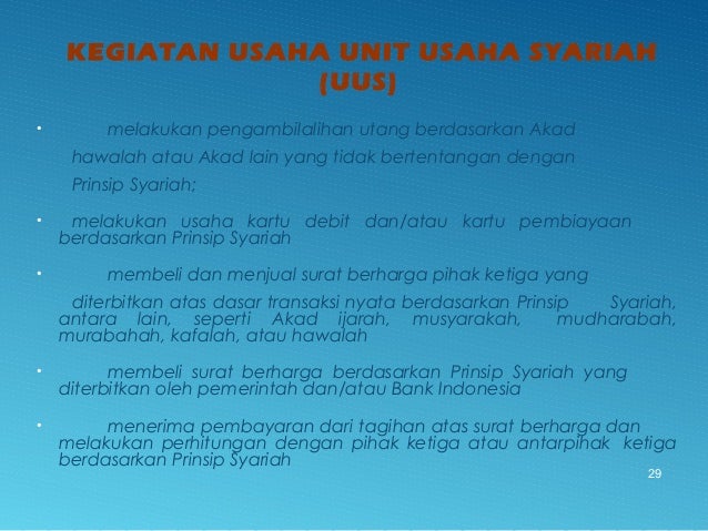 - 29. KEGIATAN USAHA UNIT USAHA SYARIAH (UUS) • melakukan pengambilalihan utang berdasarkan Akad hawalah atau Akad lain yang tidak bertentangan dengan Prinsip Syariah; • melakukan usaha kartu debit dan/atau kartu pembiayaan berdasarkan Prinsip Syariah • membeli dan menjual surat berharga pihak ketiga yang diterbitkan atas dasar transaksi nyata berdasarkan Prinsip Syariah, antara lain, seperti Akad ijarah, musyarakah, mudharabah, murabahah, kafalah, atau hawalah • membeli surat berharga berdasarkan Prinsip Syariah yang diterbitkan oleh pemerintah dan/atau Bank Indonesia • menerima pembayaran dari tagihan atas surat berharga dan melakukan perhitungan dengan pihak ketiga atau antarpihak ketiga berdasarkan Prinsip Syariah 29