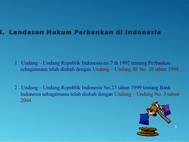 - 3. 1 . Undang – Undang Republik Indonesia no.7 th 1992 tentang Perbankan sebagaimana telah diubah dengan Undang – Undang RI No. 10 tahun 1998 2 . Undang – Undang Republik Indonesia No.23 tahun 1999 tentang Bank Indonesia sebagaimana telah diubah dengan Undang – Undang No. 3 tahun 2004 3 I. Landasan Hukum Perbankan di Indonesia
