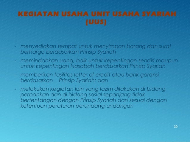 - 30. KEGIATAN USAHA UNIT USAHA SYARIAH (UUS) - menyediakan tempat untuk menyimpan barang dan surat berharga berdasarkan Prinsip Syariah - memindahkan uang, baik untuk kepentingan sendiri maupun untuk kepentingan Nasabah berdasarkan Prinsip Syariah - memberikan fasilitas letter of credit atau bank garansi berdasarkan Prinsip Syariah; dan - melakukan kegiatan lain yang lazim dilakukan di bidang perbankan dan di bidang sosial sepanjang tidak bertentangan dengan Prinsip Syariah dan sesuai dengan ketentuan peraturan perundang-undangan 30