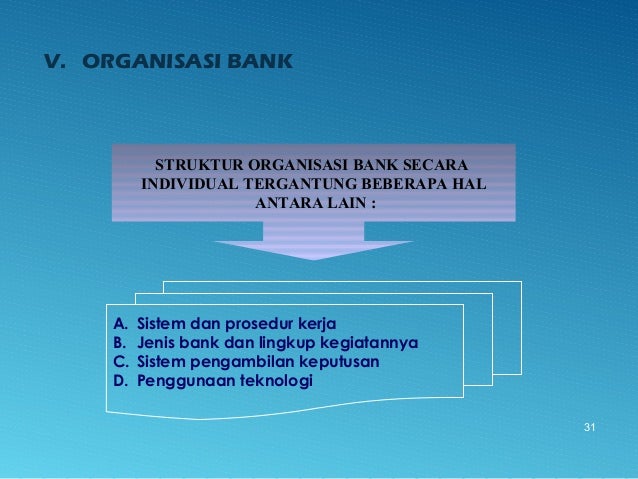 - 31. 31 V. ORGANISASI BANK STRUKTUR ORGANISASI BANK SECARA INDIVIDUAL TERGANTUNG BEBERAPA HAL ANTARA LAIN : A. Sistem dan prosedur kerja B. Jenis bank dan lingkup kegiatannya C. Sistem pengambilan keputusan D. Penggunaan teknologi