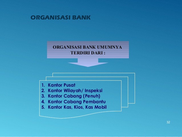 - 32. 32 ORGANISASI BANK ORGANISASI BANK UMUMNYA TERDIRI DARI : 1. Kantor Pusat 2. Kantor Wilayah/ Inspeksi 3. Kantor Cabang (Penuh) 4. Kantor Cabang Pembantu 5. Kantor Kas, Kios, Kas Mobil
