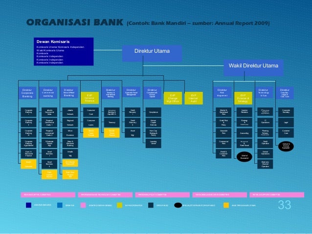 - 33. Dewan Komisaris Komisaris Utama/ Komisaris Independen Wakil Komisaris Utama Komisaris Komisaris Independen Komisaris Independen Komisaris Independen Direktur Utama Direktur Corporate Banking Direktur Commercial Banking Direktur Micro & Retail Banking Direktur Treasury & International Banking Direktur Specialist Asset Management Direktur Compliance & Human Capital EVP Change Mgt Office EVP Internal Audit EVP Consumer Finance Mandiri Sekuritas Corporate Banking I Corporate Banking II Corporate Banking III Synd. & Structured Finance Corporate Banking Agro-Based Jakarta Commercial Sales Regional Commerical Sales 1 Small Business I Regional commercial Sales 2 Wholesale Produk Mgt Bank Syariah Mandiri Small Business II Jakarta Network Regional Network Micro Business Mass & Electronic Banking Wealth Mgt Bank Sinar Harapan Bali AXA Mandiri Financial S. Consumer Card Consumer Loans International Banking & Cap.Mkt. S. Treasury Mandiri Tunas Finance Mandiri Tunas Finance Credit Recovery I Credit Recovery II Asset Mgt Compliance Human Capital Services Hum.Cap. Strategy & Policy Learning Center Direktur Risk Magement Direktur Corp.Sec, Legal & Cust. Care Direktur Technology & Ops.EVP Finance & Strategy Market & Operational Risk Credit Risk & Policy Corporate Risk Commercial Risk Retail & Consumer Risk IT Bussiness Solution & App.Services IT Operations Central Operations Planning Policies, Proced. Arch. Credit Operation Electronic Channel Operation Investor Relations Strategy & Performance Accounting Procurement & Fixed Asset Corporate Secretary Legal Customer Care Wakil Direktur Utama RISK AND CAPITAL COMMITTEE INFORMATION AND TECHNOLOGY COMMITTEE PERSONNEL POLICY COMMITTEE IWHOLSESALE EXECUTIVE COMMITTEE RETAIL & SUPPORT COMMITTEE DEWAN KOMISARIS DIREKTUR KOMITE DI BAWAH DIREKSI EVP KOORDINATOR GROUP HEAD SPECIALIST SETINGKAT GROUP HEAD ANAK PERUSAHAAN UTAMA ORGANISASI BANK (Contoh: Bank Mandiri – sumber: Annual Report 2009) Chief of Economist Culture & Service Specialist 33