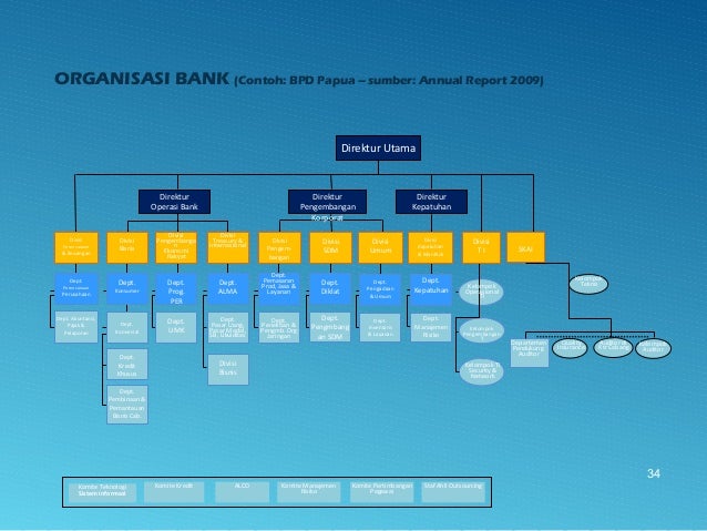 - 34. Komite Teknologi Sistem informasi Komite Kredit ALCO Komite Manajemen Risiko Komite Pertimbangan Pegawai Staf Ahli Outsourcing Direktur Operasi Bank Direktur Utama Direktur Pengembangan Korporat Direktur Kepatuhan Divisi Perencanaan & Keuangan Divisi Bisnis Divisi Pengembanga n Ekonomi Rakyat Divisi Treasury & Internasional Divisi Pengem- bangan Divisi SDM Divisi Umum Divisi Kepatuhan & ManRisk Divisi T I SKAI Dept. Perencanaan Perusahaan Dept. Akuntansi, Pajak & Pelaporan Dept. Pembinaan & Pemantauan Bisnis Cab. Dept. Konsumer Dept. Komersial Dept. Kredit Khusus Dept. Prog. PER Dept. UMK Dept. ALMA Dept. Pasar Uang, Pasar Modal, SB, Likuiditas Divisi Bisnis Dept. Kepatuhan Dept. Manajemen Risiko Dept. Pengadaan & Umum Dept. Inventaris & Layanan Dept. Diklat Dept. Pengmbang an SDM Dept. Pemasaran Prod, Jasa & Layanan Dept. Penelitian & Pengmb. Org Jaringan Departemen Pendukung Auditor Auditor di Ktr Cabang Kelompok Auditor Kelompok Operasional TI Kelompok Pengembangan T Kelompok TI Security & Network Quality Insurance Kelompok Teknis ORGANISASI BANK (Contoh: BPD Papua – sumber: Annual Report 2009) 34