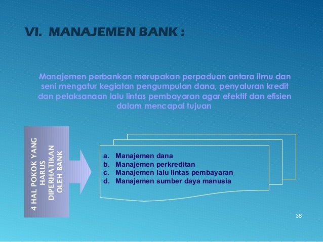 - 36. VI. MANAJEMEN BANK : Manajemen perbankan merupakan perpaduan antara ilmu dan seni mengatur kegiatan pengumpulan dana, penyaluran kredit dan pelaksanaan lalu lintas pembayaran agar efektif dan efisien dalam mencapai tujuan 36 4HALPOKOKYANG HARUS DIPERHATIKAN OLEHBANK a. Manajemen dana b. Manajemen perkreditan c. Manajemen lalu lintas pembayaran d. Manajemen sumber daya manusia