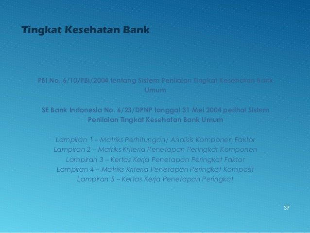 - 37. 37 Tingkat Kesehatan Bank PBI No. 6/10/PBI/2004 tentang Sistem Penilaian Tingkat Kesehatan Bank Umum SE Bank Indonesia No. 6/23/DPNP tanggal 31 Mei 2004 perihal Sistem Penilaian Tingkat Kesehatan Bank Umum Lampiran 1 – Matriks Perhitungan/ Analisis Komponen Faktor Lampiran 2 – Matriks Kriteria Penetapan Peringkat Komponen Lampiran 3 – Kertas Kerja Penetapan Peringkat Faktor Lampiran 4 – Matriks Kriteria Penetapan Peringkat Komposit Lampiran 5 – Kertas Kerja Penetapan Peringkat