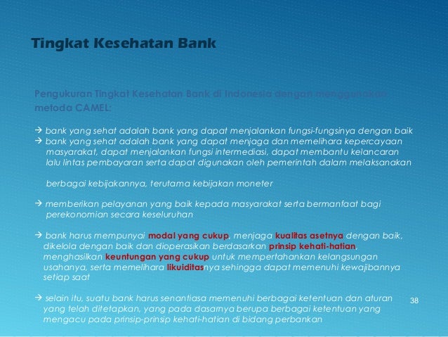 - 38. Tingkat Kesehatan Bank Pengukuran Tingkat Kesehatan Bank di Indonesia dengan menggunakan metoda CAMEL: bank yang sehat adalah bank yang dapat menjalankan fungsi-fungsinya dengan baik bank yang sehat adalah bank yang dapat menjaga dan memelihara kepercayaan masyarakat, dapat menjalankan fungsi intermediasi, dapat membantu kelancaran lalu lintas pembayaran serta dapat digunakan oleh pemerintah dalam melaksanakan berbagai kebijakannya, terutama kebijakan moneter memberikan pelayanan yang baik kepada masyarakat serta bermanfaat bagi perekonomian secara keseluruhan bank harus mempunyai modal yang cukup, menjaga kualitas asetnya dengan baik, dikelola dengan baik dan dioperasikan berdasarkan prinsip kehati-hatian, menghasilkan keuntungan yang cukup untuk mempertahankan kelangsungan usahanya, serta memelihara likuiditasnya sehingga dapat memenuhi kewajibannya setiap saat selain itu, suatu bank harus senantiasa memenuhi berbagai ketentuan dan aturan yang telah ditetapkan, yang pada dasarnya berupa berbagai ketentuan yang mengacu pada prinsip-prinsip kehati-hatian di bidang perbankan 38