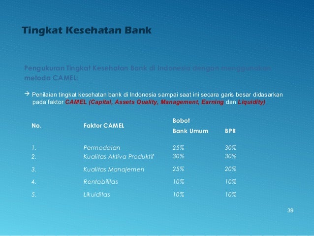 - 39. Tingkat Kesehatan Bank Pengukuran Tingkat Kesehatan Bank di Indonesia dengan menggunakan metoda CAMEL: Penilaian tingkat kesehatan bank di Indonesia sampai saat ini secara garis besar didasarkan pada faktor CAMEL (Capital, Assets Quality, Management, Earning dan Liquidity) No. Faktor CAMEL Bobot Bank Umum BPR 1. 2. 3. 4. 5. Permodalan Kualitas Aktiva Produktif Kualitas Manajemen Rentabilitas Likuiditas 25% 30% 25% 10% 10% 30% 30% 20% 10% 10% 39