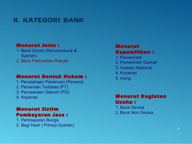 - 4. II. KATEGORI BANK 4 Menurut Jenis : 1. Bank Umum (Konvensional & Syariah) 2. Bank Perkreditan Rakyat Menurut Kepemilikan : 1. Pemerintah 2. Pemerintah Daerah 3. Swasta Nasional 4. Koperasi 5. Asing Menurut Kegiatan Usaha : 1. Bank Devisa 2. Bank Non Devisa Menurut Bentuk Hukum : 1. Perusahaan Perseroan (Persero) 2. Perseroan Terbatas (PT) 3. Perusahaan Daerah (PD) 4. Koperasi Menurut Sistim Pembayaran Jasa : 1. Pembayaran Bunga 2. Bagi Hasil ( Prinsip Syariah)