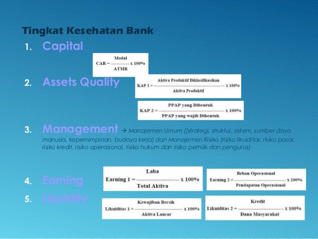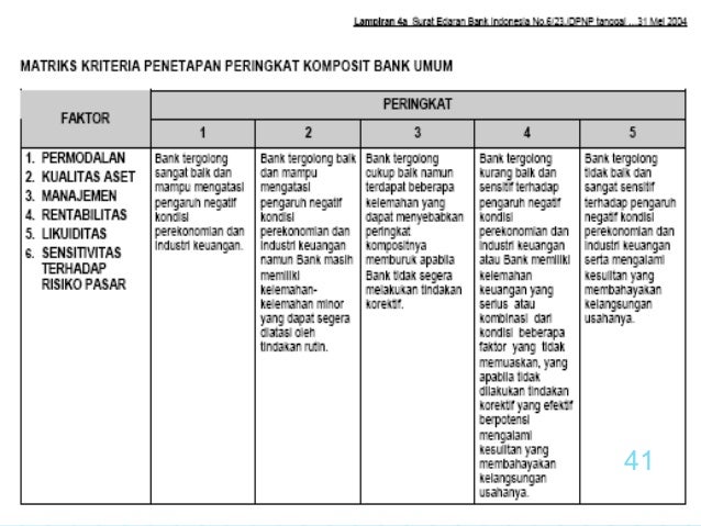 - 40. Tingkat Kesehatan Bank 1. Capital 2. Assets Quality 3. Management Manajemen Umum ((strategi, struktur, sistem, sumber daya manusia, kepemimpinan, budaya kerja) dan Manajemen Risiko (risiko likuiditas, risiko pasar, risiko kredit, risiko operasional, risiko hukum dan risiko pemilik dan pengurus) 4. Earning 5. Liquidity 40