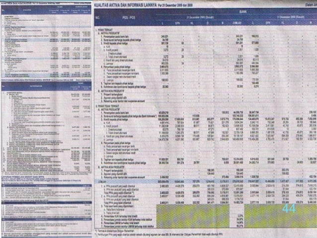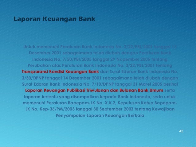 - 42. 42 Laporan Keuangan Bank Untuk memenuhi Peraturan Bank Indonesia No. 3/22/PBI/2001 tanggal 13 Desember 2001 sebagaimana telah diubah dengan Peraturan Bank Indonesia No. 7/50/PBI/2005 tanggal 29 Nopember 2005 tentang Perubahan atas Peraturan Bank Indonesia No. 3/22/PBI/2001 tentang Transparansi Kondisi Keuangan Bank dan Surat Edaran Bank Indonesia No. 3/30/DPNP tanggal 14 Desember 2001 sebagaimana telah diubah dengan Surat Edaran Bank Indonesia No. 7/10/DPNP tanggal 31 Maret 2005 perihal Laporan Keuangan Publikasi Triwulanan dan Bulanan Bank Umum serta laporan tertentu yang disampaikan kepada Bank Indonesia, serta untuk memenuhi Peraturan Bapepam-LK No. X.K.2, Keputusan Ketua Bapepam- LK No. Kep-36/PM/2003 tanggal 30 September 2003 tentang Kewajiban Penyampaian Laporan Keuangan Berkala