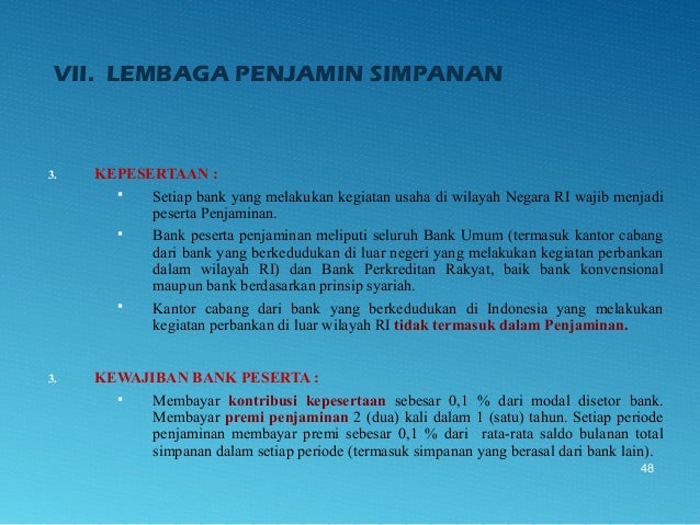 - 48. VII. LEMBAGA PENJAMIN SIMPANAN 3. KEPESERTAAN : Setiap bank yang melakukan kegiatan usaha di wilayah Negara RI wajib menjadi peserta Penjaminan. Bank peserta penjaminan meliputi seluruh Bank Umum (termasuk kantor cabang dari bank yang berkedudukan di luar negeri yang melakukan kegiatan perbankan dalam wilayah RI) dan Bank Perkreditan Rakyat, baik bank konvensional maupun bank berdasarkan prinsip syariah. Kantor cabang dari bank yang berkedudukan di Indonesia yang melakukan kegiatan perbankan di luar wilayah RI tidak termasuk dalam Penjaminan. 3. KEWAJIBAN BANK PESERTA : Membayar kontribusi kepesertaan sebesar 0,1 % dari modal disetor bank. Membayar premi penjaminan 2 (dua) kali dalam 1 (satu) tahun. Setiap periode penjaminan membayar premi sebesar 0,1 % dari rata-rata saldo bulanan total simpanan dalam setiap periode (termasuk simpanan yang berasal dari bank lain). 48