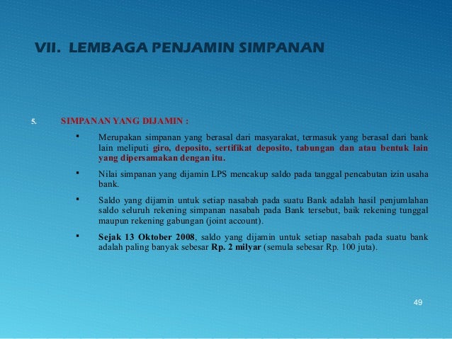 - 49. VII. LEMBAGA PENJAMIN SIMPANAN 5. SIMPANAN YANG DIJAMIN : Merupakan simpanan yang berasal dari masyarakat, termasuk yang berasal dari bank lain meliputi giro, deposito, sertifikat deposito, tabungan dan atau bentuk lain yang dipersamakan dengan itu. Nilai simpanan yang dijamin LPS mencakup saldo pada tanggal pencabutan izin usaha bank. Saldo yang dijamin untuk setiap nasabah pada suatu Bank adalah hasil penjumlahan saldo seluruh rekening simpanan nasabah pada Bank tersebut, baik rekening tunggal maupun rekening gabungan (joint account). Sejak 13 Oktober 2008, saldo yang dijamin untuk setiap nasabah pada suatu bank adalah paling banyak sebesar Rp. 2 milyar (semula sebesar Rp. 100 juta). 49