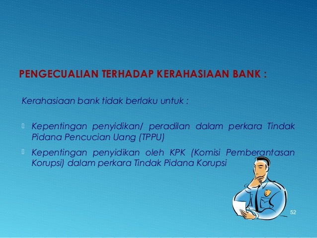 - 52. PENGECUALIAN TERHADAP KERAHASIAAN BANK : Kerahasiaan bank tidak berlaku untuk : Kepentingan penyidikan/ peradilan dalam perkara Tindak Pidana Pencucian Uang (TPPU) Kepentingan penyidikan oleh KPK (Komisi Pemberantasan Korupsi) dalam perkara Tindak Pidana Korupsi 52