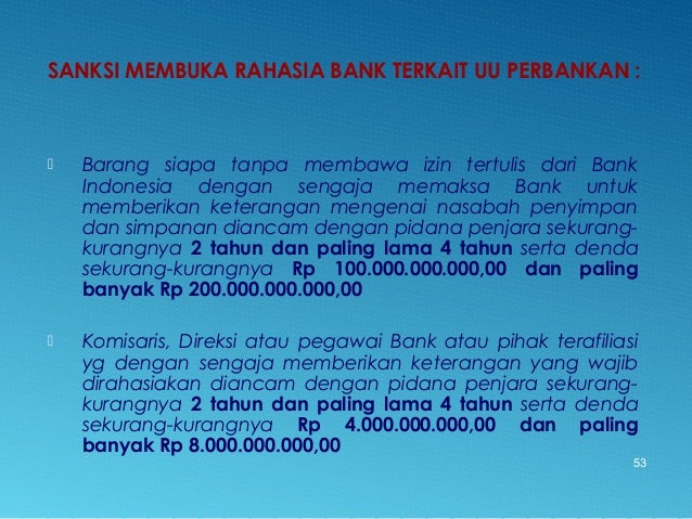 - 53. SANKSI MEMBUKA RAHASIA BANK TERKAIT UU PERBANKAN : Barang siapa tanpa membawa izin tertulis dari Bank Indonesia dengan sengaja memaksa Bank untuk memberikan keterangan mengenai nasabah penyimpan dan simpanan diancam dengan pidana penjara sekurang- kurangnya 2 tahun dan paling lama 4 tahun serta denda sekurang-kurangnya Rp 100.000.000.000,00 dan paling banyak Rp 200.000.000.000,00 Komisaris, Direksi atau pegawai Bank atau pihak terafiliasi yg dengan sengaja memberikan keterangan yang wajib dirahasiakan diancam dengan pidana penjara sekurang- kurangnya 2 tahun dan paling lama 4 tahun serta denda sekurang-kurangnya Rp 4.000.000.000,00 dan paling banyak Rp 8.000.000.000,00 53