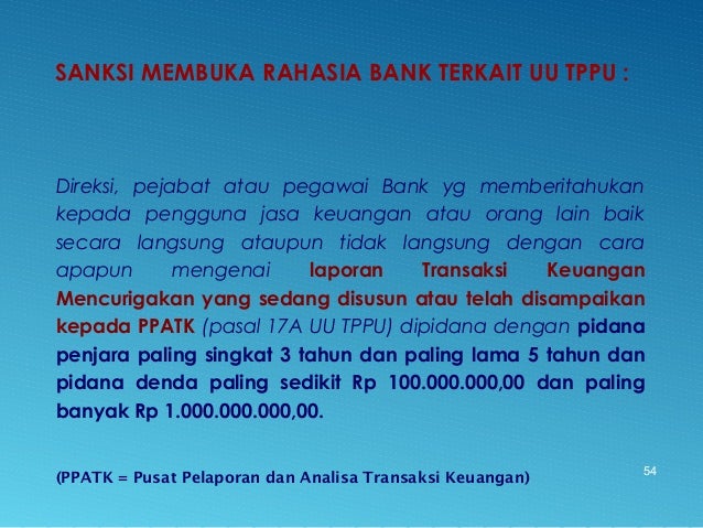 - 54. SANKSI MEMBUKA RAHASIA BANK TERKAIT UU TPPU : Direksi, pejabat atau pegawai Bank yg memberitahukan kepada pengguna jasa keuangan atau orang lain baik secara langsung ataupun tidak langsung dengan cara apapun mengenai laporan Transaksi Keuangan Mencurigakan yang sedang disusun atau telah disampaikan kepada PPATK (pasal 17A UU TPPU) dipidana dengan pidana penjara paling singkat 3 tahun dan paling lama 5 tahun dan pidana denda paling sedikit Rp 100.000.000,00 dan paling banyak Rp 1.000.000.000,00. (PPATK = Pusat Pelaporan dan Analisa Transaksi Keuangan) 54