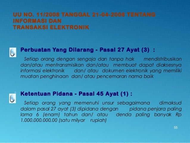 - 55. UU NO. 11/2008 TANGGAL 21-04-2008 TENTANG INFORMASI DAN TRANSAKSI ELEKTRONIK Perbuatan Yang Dilarang - Pasal 27 Ayat (3) : Setiap orang dengan sengaja dan tanpa hak mendistribusikan dan/atau mentransmisikan dan/atau membuat dapat diaksesnya informasi elektronik dan/ atau dokumen elektronik yang memiliki muatan penghinaan dan/ atau pencemaran nama baik Ketentuan Pidana - Pasal 45 Ayat (1) : Setiap orang yang memenuhi unsur sebagaimana dimaksud dalam pasal 27 ayat (3) dipidana dengan pidana penjara paling lama 6 (enam) tahun dan/ atau denda paling banyak Rp 1.000.000.000,00 (satu milyar rupiah) 55