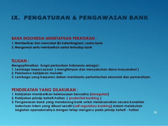 - 56. IX. PENGATURAN & PENGAWASAN BANK BANK INDONESIA MENETAPKAN PERATURAN : 1. Memberikan dan mencabut ijin kelembagaan/ usaha bank 2. Mengawasi serta memberikan sanksi terhadap bank 56 TUJUAN : Mengoptimalkan fungsi perbankan indonesia sebagai : 1. Lembaga kepercayaan ( menghimpun dan menyalurkan dana masyarakat ) 2. Pelaksana kebijakan moneter 3. Lembaga yang berperan dalam membantu pertumbuhan ekonomi dan pemerataan. PENDEKATAN YANG DILAKUKAN : 1. Kebijakan memberikan keleluasaan berusaha (deregulasi) 2. Kebijakan prinsip kehati–hatian ( prudential banking ) 3. Pengawasan bank yang mendorong bank untuk melaksanakan secara konsisten ketentuan intern yang dibuat sendiri (self regulatory banking) dalam melakukan kegiatan operasionalnya dengan tetap mengacu pada prinsip kehati - hatian