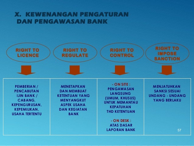 - 57. X. KEWENANGAN PENGATURAN DAN PENGAWASAN BANK 57 PEMBERIAN / PENCABUTAN IJIN BANK / CABANG, KEPENGURUSAN, KEPEMILIKAN, USAHA TERTENTU MENETAPKAN DAN MEMBUAT KETENTUAN YANG MENYANGKUT ASPEK USAHA DAN KEGIATAN BANK - ON SITE : PENGAWASAN LANGSUNG (UMUM, KHUSUS) UNTUK MEMANTAU KEPATUHAN THD KETENTUAN - ON DESK : ATAS DASAR LAPORAN BANK MENJATUHKAN SANKSI SESUAI UNDANG - UNDANG YANG BERLAKU RIGHT TO LICENCE RIGHT TO REGULATE RIGHT TO CONTROL RIGHT TO IMPOSE SANCTION