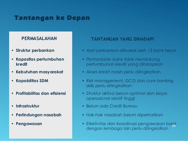 - 59. TANTANGAN YANG DIHADAPI • Struktur perbankan • Aset perbankan dikuasai oleh 13 bank besar • Kapasitas pertumbuhan kredit • Permodalan bank tidak mendukung pertumbuhan kredit yang diharapkan • Kebutuhan masyarakat • Akses kredit masih perlu ditingkatkan, • Kapabilitas SDM • Risk management, GCG dan core banking skills perlu ditingkatkan • Profitabilitas dan efisiensi • Struktur aktiva belum optimal dan biaya operasional relatif tinggi • Infrastruktur • Belum ada Credit Bureau • Perlindungan nasabah • Hak-hak nasabah belum diperhatikan • Pengawasan • Efektivitas dan koordinasi pengawasan bank dengan lembaga lain perlu ditingkatkan PERMASALAHAN Tantangan ke Depan 59