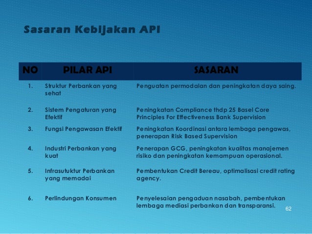 - 62. NO PILAR API SASARAN 1. Struktur Perbankan yang sehat Penguatan permodalan dan peningkatan daya saing. 2. Sistem Pengaturan yang Efektif Peningkatan Compliance thdp 25 Basel Core Principles For Effectiveness Bank Supervision 3. Fungsi Pengawasan Efektif Peningkatan Koordinasi antara lembaga pengawas, penerapan Risk Based Supervision 4. Industri Perbankan yang kuat Penerapan GCG, peningkatan kualitas manajemen risiko dan peningkatan kemampuan operasional. 5. Infrasutuktur Perbankan yang memadai Pembentukan Credit Bereau, optimalisasi credit rating agency. 6. Perlindungan Konsumen Penyelesaian pengaduan nasabah, pembentukan lembaga mediasi perbankan dan transparansi. 62 Sasaran Kebijakan API