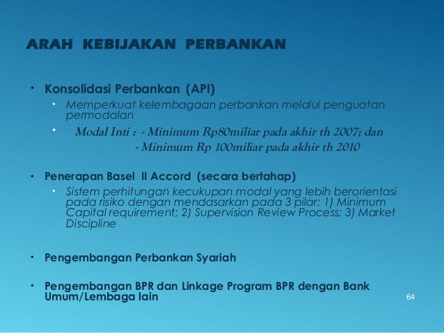 - 64. ARAH KEBIJAKAN PERBANKAN • Konsolidasi Perbankan (API) • Memperkuat kelembagaan perbankan melalui penguatan permodalan • Modal Inti : - Minimum Rp80miliar pada akhir th 2007; dan - Minimum Rp 100miliar pada akhir th 2010 • Penerapan Basel II Accord (secara bertahap) • Sistem perhitungan kecukupan modal yang lebih berorientasi pada risiko dengan mendasarkan pada 3 pilar: 1) Minimum Capital requirement; 2) Supervision Review Process; 3) Market Discipline • Pengembangan Perbankan Syariah • Pengembangan BPR dan Linkage Program BPR dengan Bank Umum/Lembaga lain 64