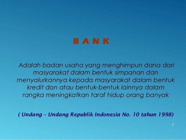 - 7. B A N K Adalah badan usaha yang menghimpun dana dari masyarakat dalam bentuk simpanan dan menyalurkannya kepada masyarakat dalam bentuk kredit dan atau bentuk-bentuk lainnya dalam rangka meningkatkan taraf hidup orang banyak ( Undang – Undang Republik Indonesia No. 10 tahun 1998) 7