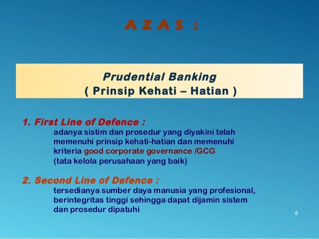 - 8. Prudential Banking ( Prinsip Kehati – Hatian ) 8 1. First Line of Defence : adanya sistim dan prosedur yang diyakini telah memenuhi prinsip kehati-hatian dan memenuhi kriteria good corporate governance /GCG (tata kelola perusahaan yang baik) 2. Second Line of Defence : tersedianya sumber daya manusia yang profesional, berintegritas tinggi sehingga dapat dijamin sistem dan prosedur dipatuhi A Z A S :
