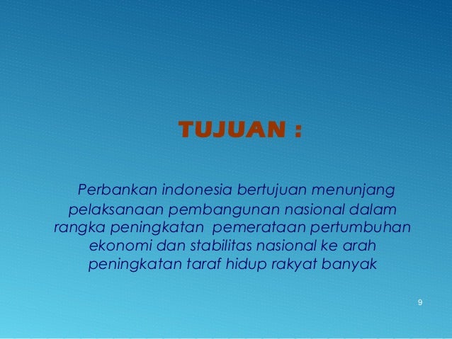 - 9. TUJUAN : Perbankan indonesia bertujuan menunjang pelaksanaan pembangunan nasional dalam rangka peningkatan pemerataan pertumbuhan ekonomi dan stabilitas nasional ke arah peningkatan taraf hidup rakyat banyak 9